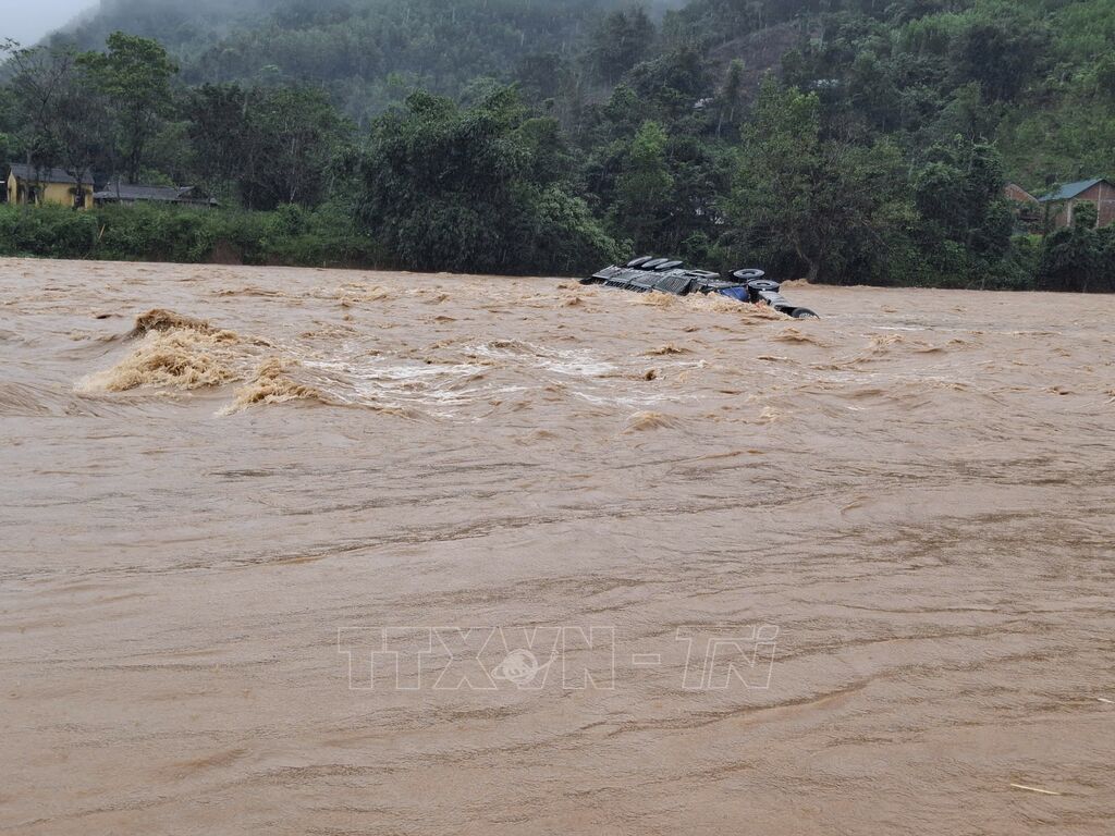 Chiếc xe container vượt ngầm tràn, tài xế bị lũ cuốn trôi mất tích.
