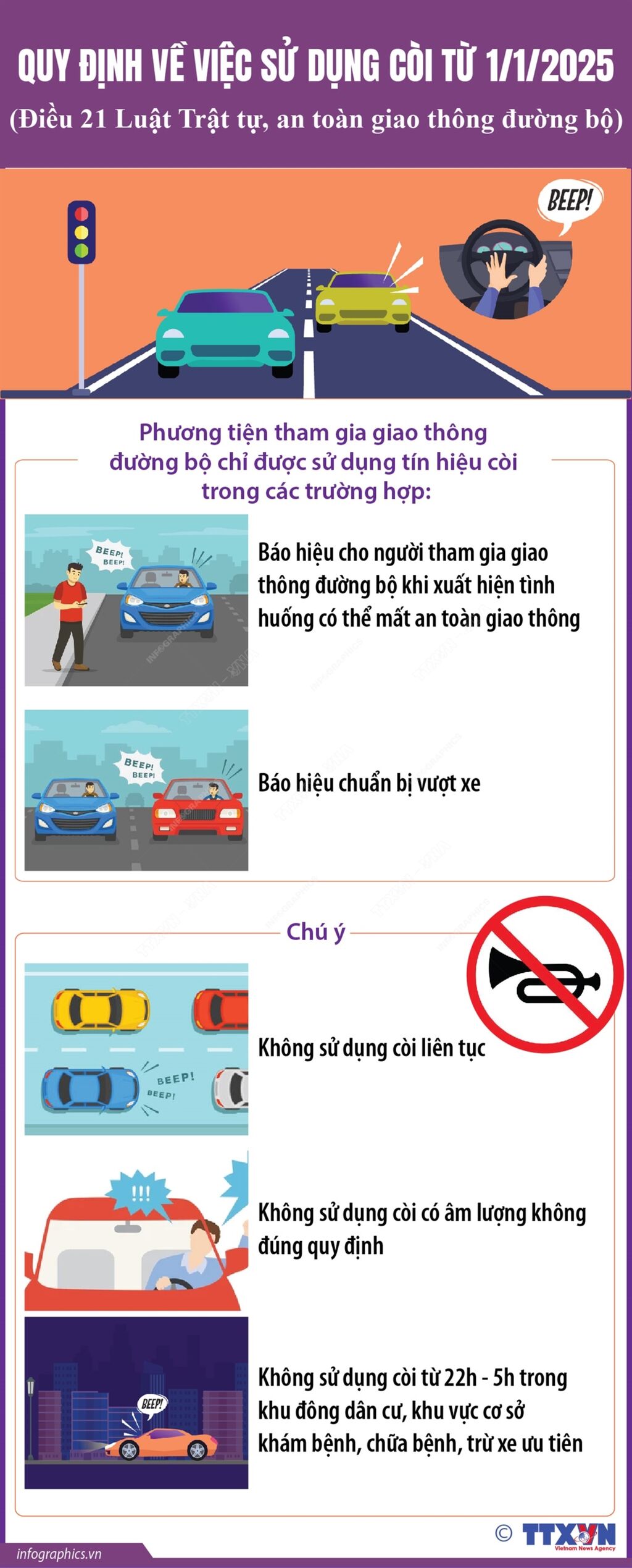 Từ 1/1/2025, chỉ được sử dụng tín hiệu còi của phương tiện tham gia giao thông đường bộ khi báo hiệu cho người tham gia giao thông đường bộ khi xuất hiện tình huống có thể mất an toàn giao thông và báo hiệu chuẩn bị vượt xe.