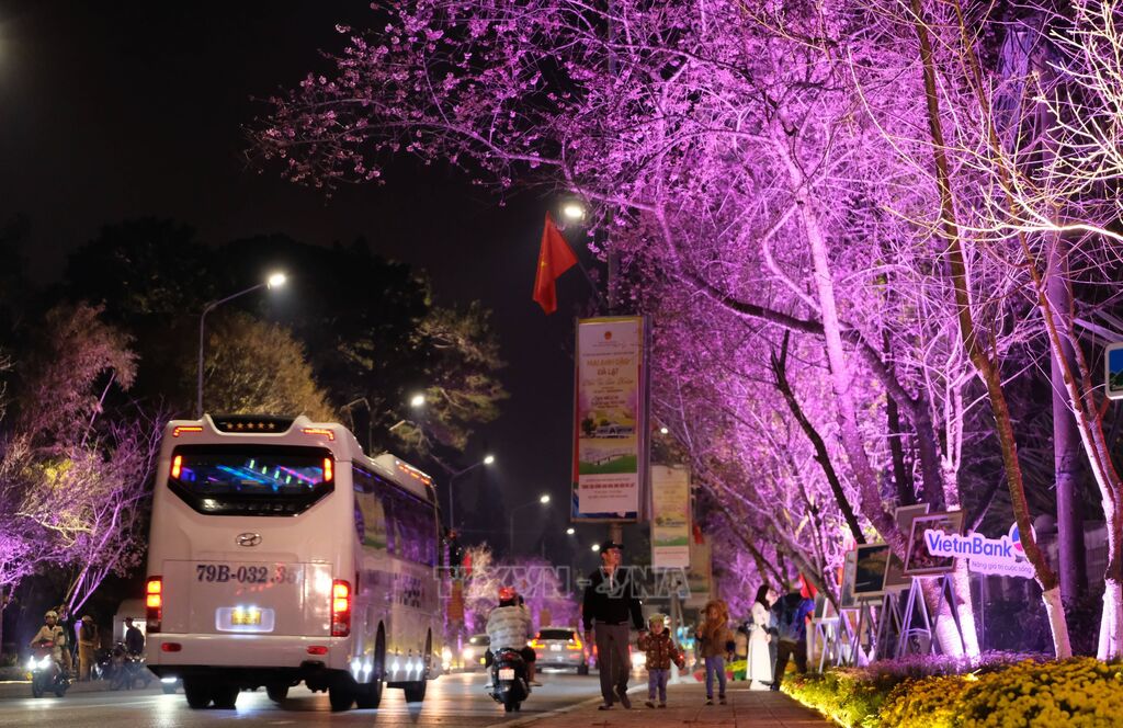 Không gian “Đường hoa ánh sáng, nghệ thuật” được bố trí dọc hai bên đường Trần Hưng Đạo dài khoảng 2km với hàng hoa mai anh đào đang bung nở rực rỡ.
