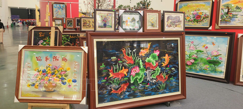 Gian hàng tranh thêu của cơ sở Đỗ Văn Sơn, làng Đào Xá, xã Chương Dương trưng bày nhiều tác phẩm tranh thêu mang đậm bản sắc văn hóa Việt. Nắm bắt thị hiếu tiêu dùng dịp Tết, đặc biệt khi năm Bính Ngọ đang cận kề, cơ sở tập trung giới thiệu các bức tranh thêu chủ đề ngựa, phong cảnh làng quê, hoa đào, hoa mai… Không chỉ phục vụ nhu cầu trang trí, các tác phẩm còn mang ý nghĩa phong thủy, gửi gắm những thông điệp tốt lành như "Thuận buồm xuôi gió", "Mã đáo thành công", "Vạn sự như ý", "Phú quý cát tường"… Bên cạnh tranh treo tường, gian hàng còn giới thiệu nhiều sản phẩm ứng dụng như túi thêu, khăn trải bàn, tranh thổ cẩm thêu tay, đáp ứng nhu cầu đa dạng của khách tham quan.