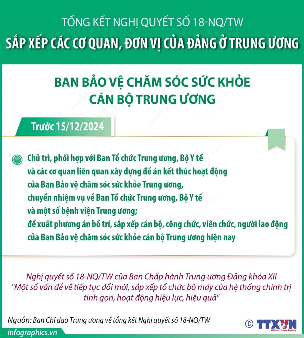 Tại Công văn số 21-CV/BCĐ ngày 5/12/2024, Ban Chỉ đạo Trung ương về tổng kết Nghị quyết số 18-NQ/TW yêu cầu Ban Bảo vệ chăm sóc sức khỏe cán bộ Trung ương chủ trì, phối hợp với Ban Tổ chức Trung ương, Bộ Y tế và các cơ quan liên quan xây dựng đề án kết thúc hoạt động của Ban Bảo vệ chăm sóc sức khỏe Trung ương, chuyển nhiệm vụ về Ban Tổ chức Trung ương, Bộ Y tế và một số bệnh viện Trung ương; đề xuất phương án bố trí, sắp xếp cán bộ, công chức, viên chức, người lao động của Ban Bảo vệ chăm sóc sức khỏe cán bộ Trung ương hiện nay (hoàn thành ngày 15/12/2024).