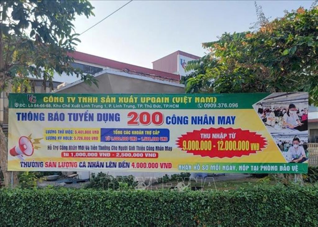 Để đảm bảo cho các đơn hàng quý I năm 2025, Công ty trách nhiệm hữu hạn sản xuất Upgain Việt Nam (Khu chế xuất Linh Trung I) cũng đăng tuyển 200 lao động ở các lĩnh vực may mặc… Trong đó, lương thử việc hơn 5,4 triệu đồng/tháng, lương ký hợp đồng hơn 5,7 triệu đồng/tháng, cộng thêm trợ cấp từ 1 - 1,5 triệu đồng/tháng, nâng tổng thu nhập trung bình lên 9 - 12 triệu đồng/tháng.