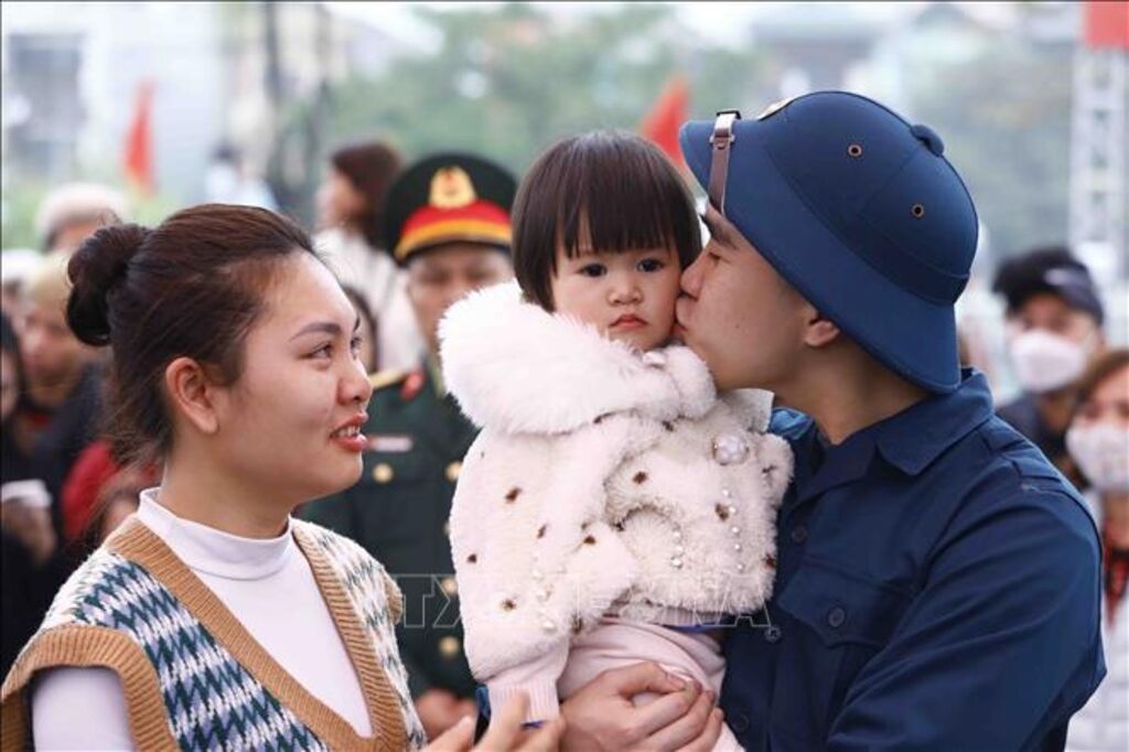 Tân binh Khúc Công Sơn (huyện Gia Lâm) chia tay gia đình trước giờ lên đường nhập ngũ. (Ảnh: An Đăng/TTXVN)