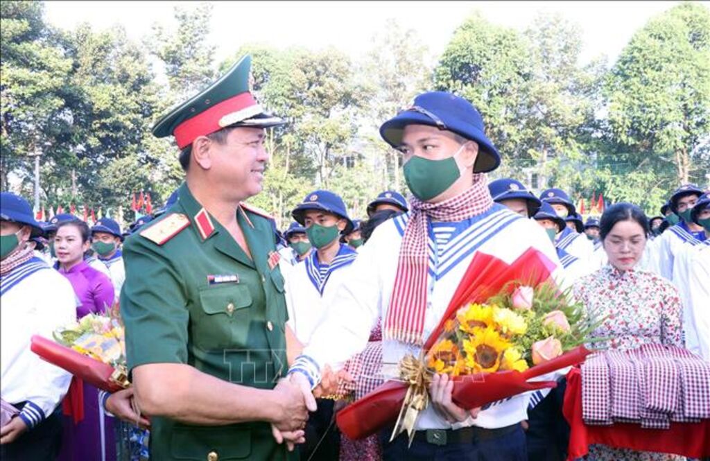 Tặng hoa cho các tân binh. (Ảnh: Quân Trang/TTXVN)