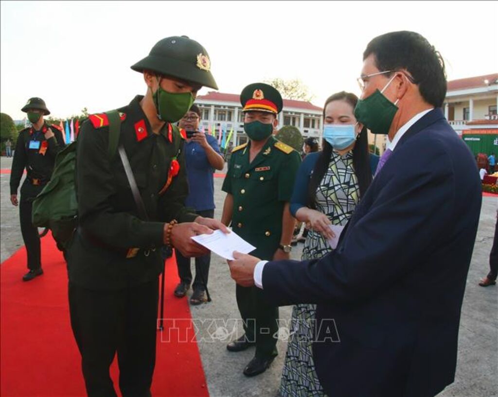 Lãnh đạo thành phố Vị Thanh (Hậu Giang) chúc mừng thanh niên lân đường nhập ngũ. (Ảnh: Duy Ba/TTXVN)
