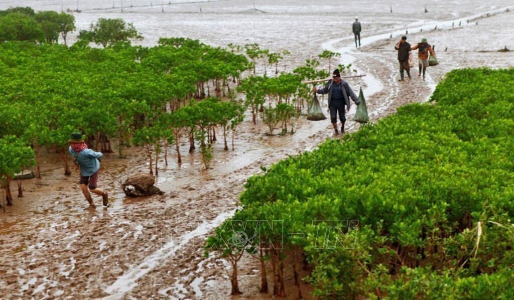 Vườn Quốc gia Xuân Thủy thuộc địa bàn huyện Giao Thủy (tỉnh Nam Định), là vùng ngập nước đầu tiên của Đông Nam Á tham gia Công ước Quốc tế RAMSAR; được UNESCO công nhận là vùng lõi của Khu Dự trữ Sinh quyển Thế giới khu vực Đồng bằng châu thổ sông Hồng. Trong ảnh: Người dân khai thác thủy, hải sản dưới tán rừng ngập mặn ở Vườn Quốc gia Xuân Thủy (Nam Định).