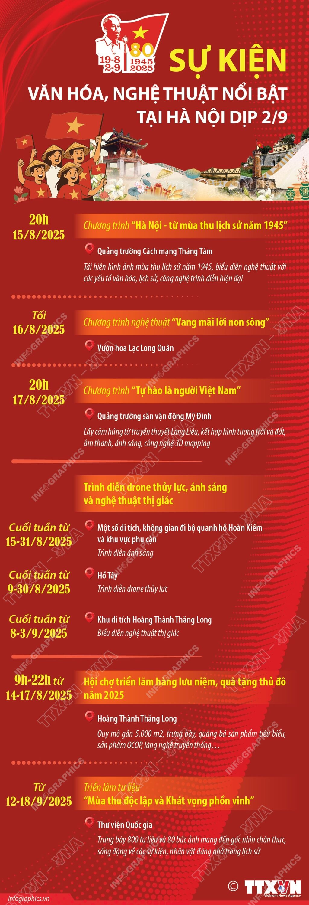 Nhiều hoạt động văn hóa, nghệ thuật, triển lãm và hội chợ được tổ chức khắp Hà Nội nhằm chào mừng 80 năm Cách mạng tháng Tám và Quốc khánh 2/9.