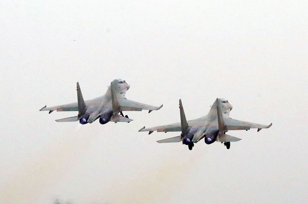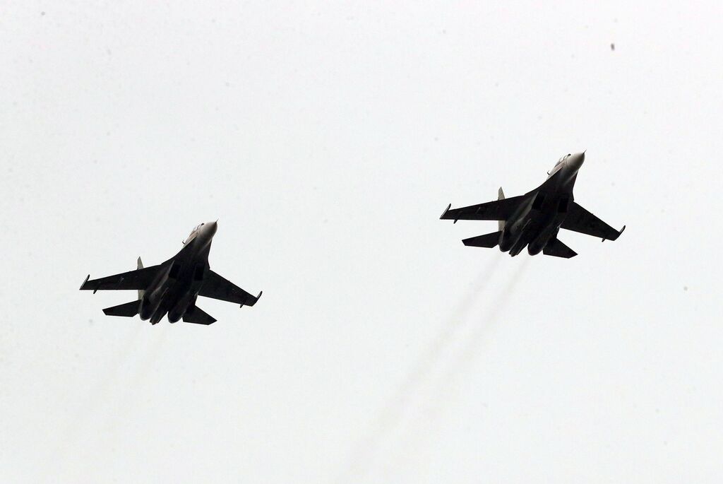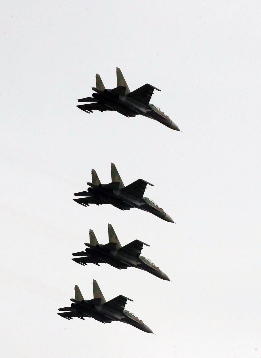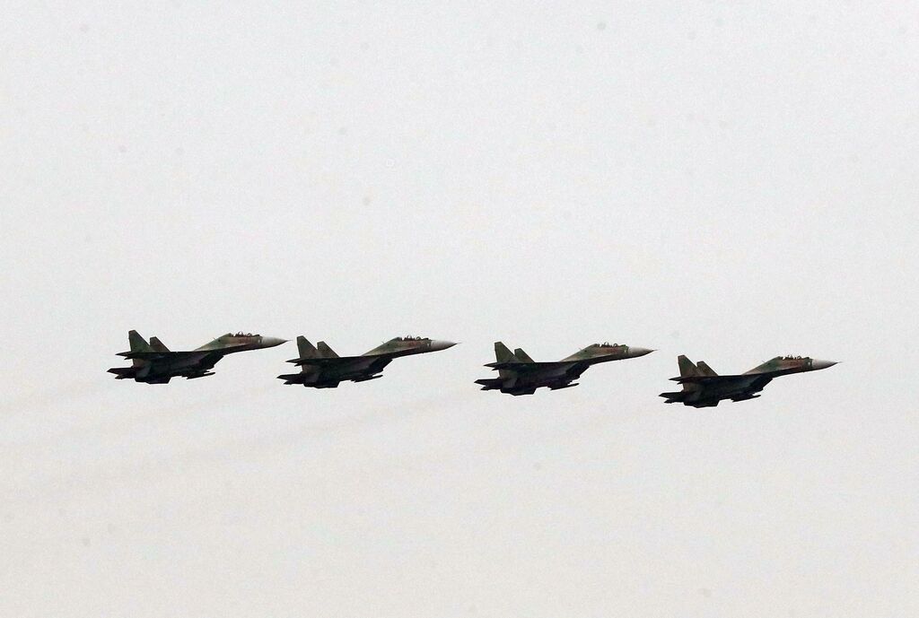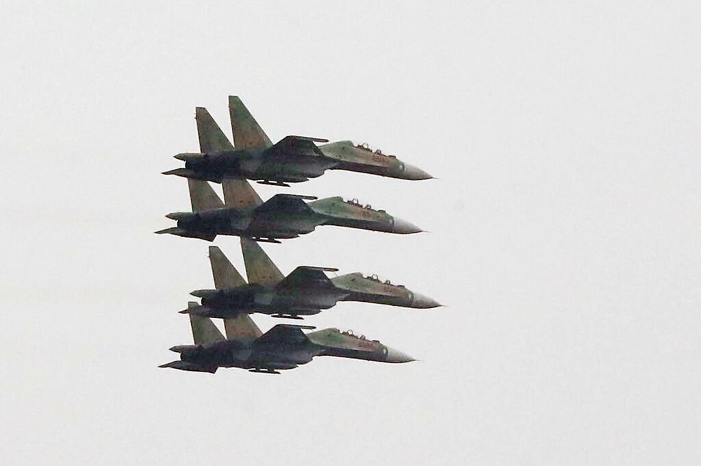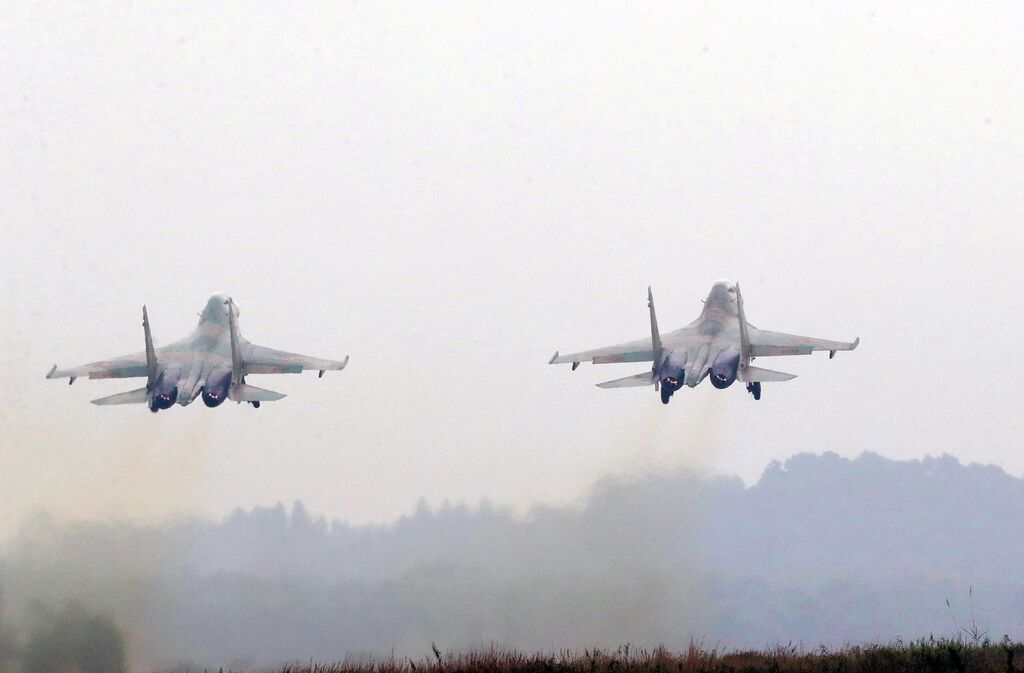 Máy bay Su30 cất cánh luyện tập theo các kịch bản trình diễn phục vụ Triển lãm Quốc phòng quốc tế 2022. (Ảnh: Trọng Đức/TTXVN)