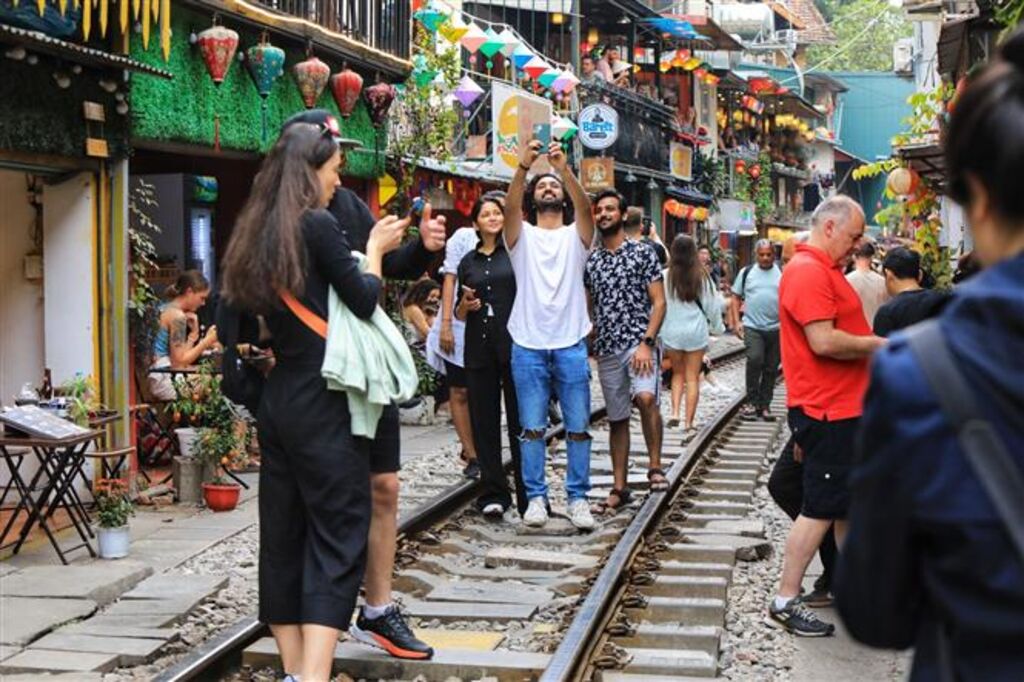 Du khách nước ngoài tụ tập rất đông để trải nghiệm chụp ảnh ngay trên đường tàu. (Ảnh: Tuấn Anh/TTXVN)