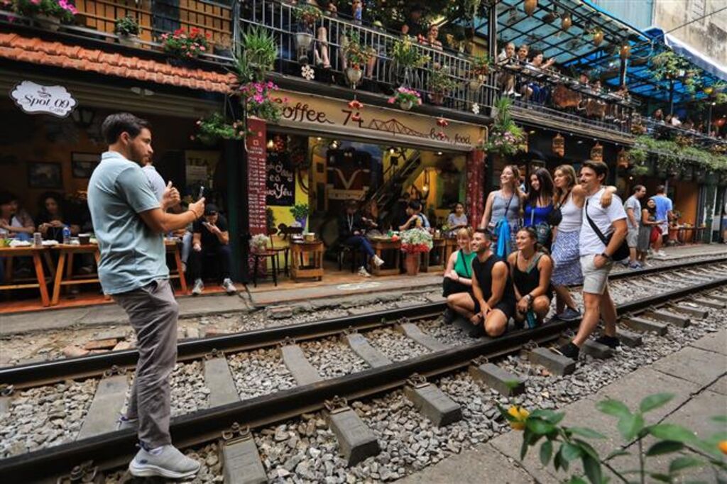 Vào 2 ngày nghỉ cuối tuần Thứ Bảy và Chủ nhật, lượng khách nước ngoài đến "Phố cafe đường tàu" tăng đột biến. (Ảnh: Tuấn Anh/TTXVN)