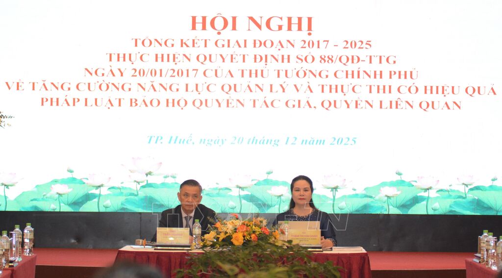 Chiều 20/12, tại thành phố Huế, Cục Bản quyền tác giả (Bộ Văn hóa, Thể thao và Du lịch) phối hợp với Sở Du lịch thành phố Huế tổ chức Hội nghị tổng kết giai đoạn 2017-2025 thực hiện Quyết định số 88/QĐ-TTg ngày 20/01/2017 của Thủ tướng Chính phủ về việc phê duyệt đề án tăng cường năng lực quản lý và thực thi có hiệu quả pháp luật bảo hộ quyền tác giả, quyền liên quan.