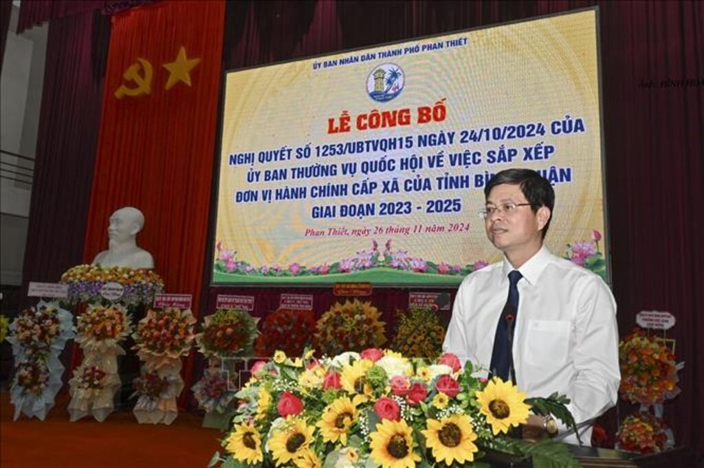 Sáng 26/11, Ủy ban nhân dân (UBND) thành phố Phan Thiết tổ chức Lễ công bố việc sắp xếp đơn vị hành chính cấp xã của tỉnh Bình Thuận giai đoạn 2023 - 2025.