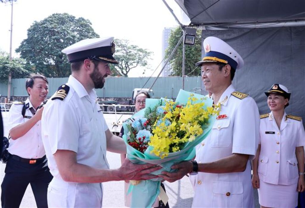 Đại tá Lê Nam Sơn, Phó Lữ đoàn trưởng Lữ đoàn 125, Bộ Tư lệnh Vùng 2 Hải quân đại diện lãnh đạo Quân chủng Hải quân Việt Nam và tân Đại sứ Vương quốc Anh tại Việt Nam, ông Iain Frew cùng dự lễ đón tàu.