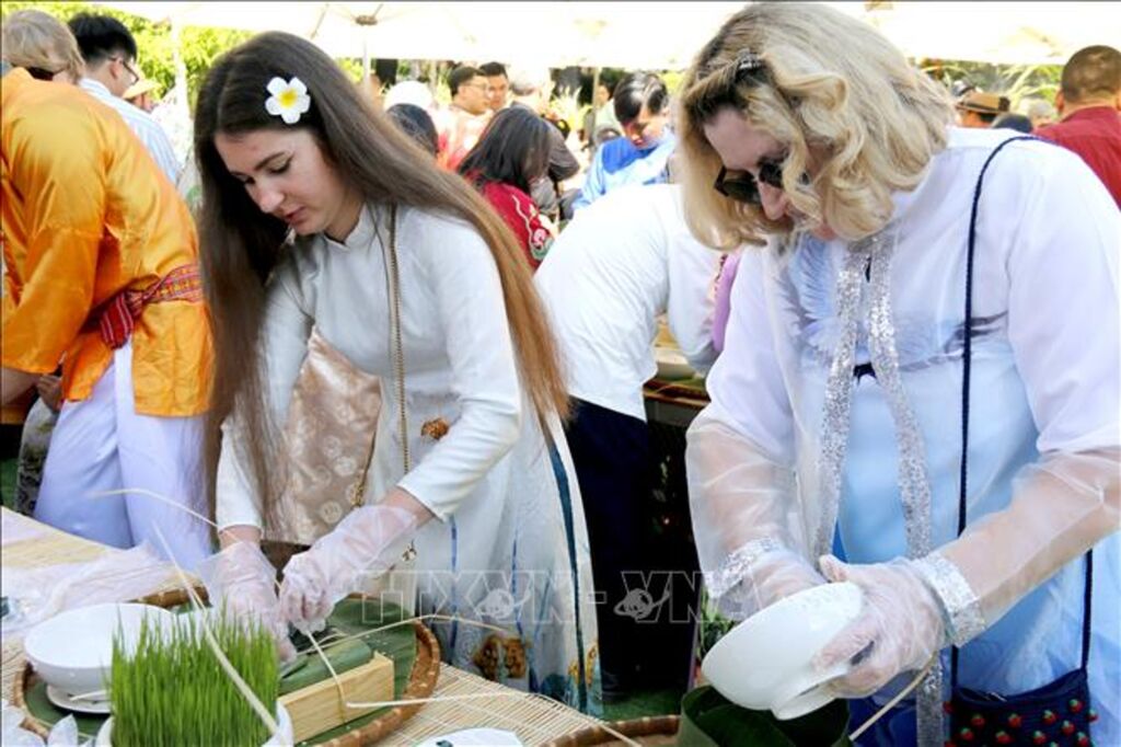 Hơn 200 du khách đến từ nhiều quốc gia như: Australia, Phần Lan, Nga, Đức... đã được trải nghiệm mặc những bộ trang phục truyền thống của các dân tộc Việt và được tận tay gói những chiếc bánh chưng lá dong.