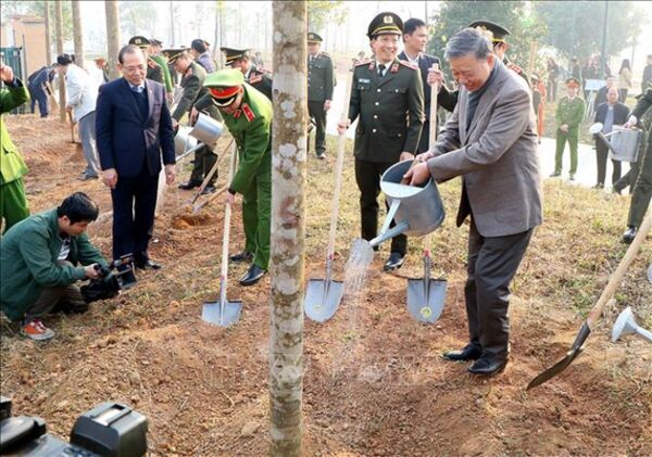Đại tướng Tô Lâm, Bộ trưởng Bộ Công an cùng các đại biểu trồng cây lưu niệm tại Khu di tích lịch sử Quốc gia đặc biệt Đền Hùng. (Ảnh: Trung Kiên/TTXVN)
