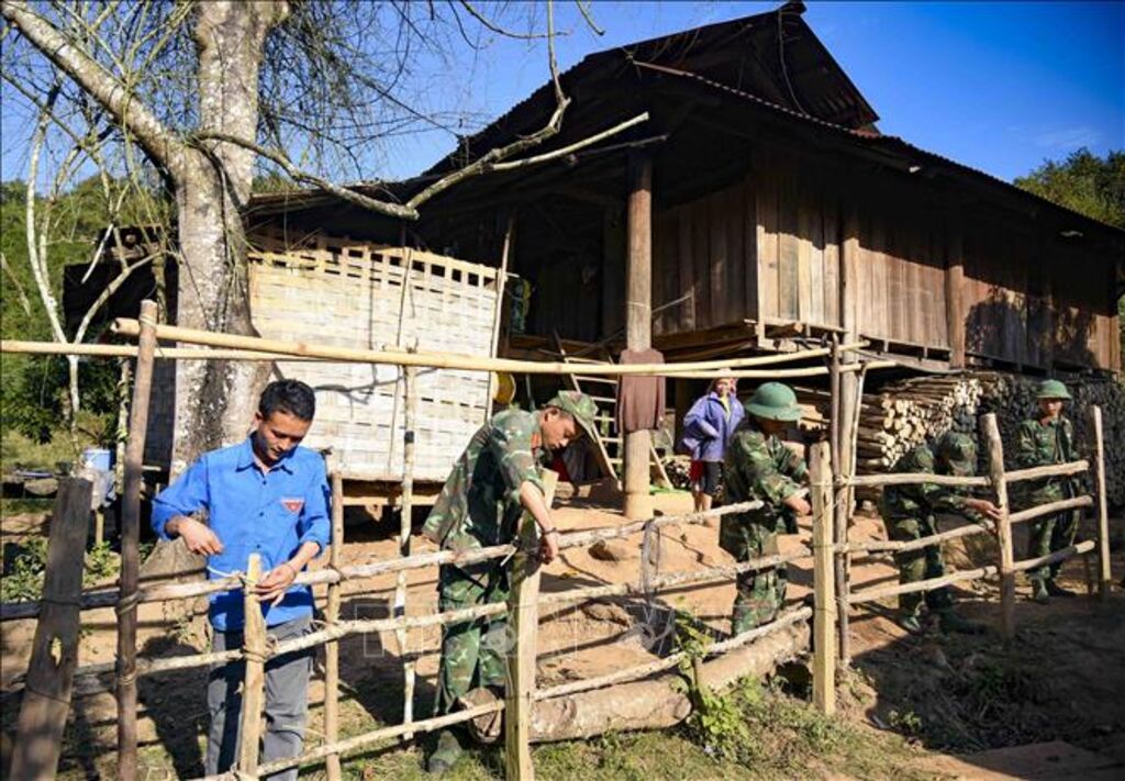 TTXVN - Những ngày gần Tết Nguyên đán Giáp Thìn 2024, trên xã vùng cao Nậm Vì, huyện biên giới Mường Nhé (tỉnh Điện Biên), cán bộ, chiến sĩ Trung đoàn 741, Bộ Chỉ huy Quân sự tỉnh Điện Biên đang miệt mài các hoạt động hỗ trợ dân bản an cư đón Tết. Xuân này, nhiều người dân ở Nậm Vì sẽ được đón cái Tết ấm cúng, đủ đầy hơn vì sự có mặt trong gần một tháng qua của các chiến sĩ đã cùng ăn, cùng ở, cùng làm và cùng nói tiếng đồng bào với bà con nơi đây.