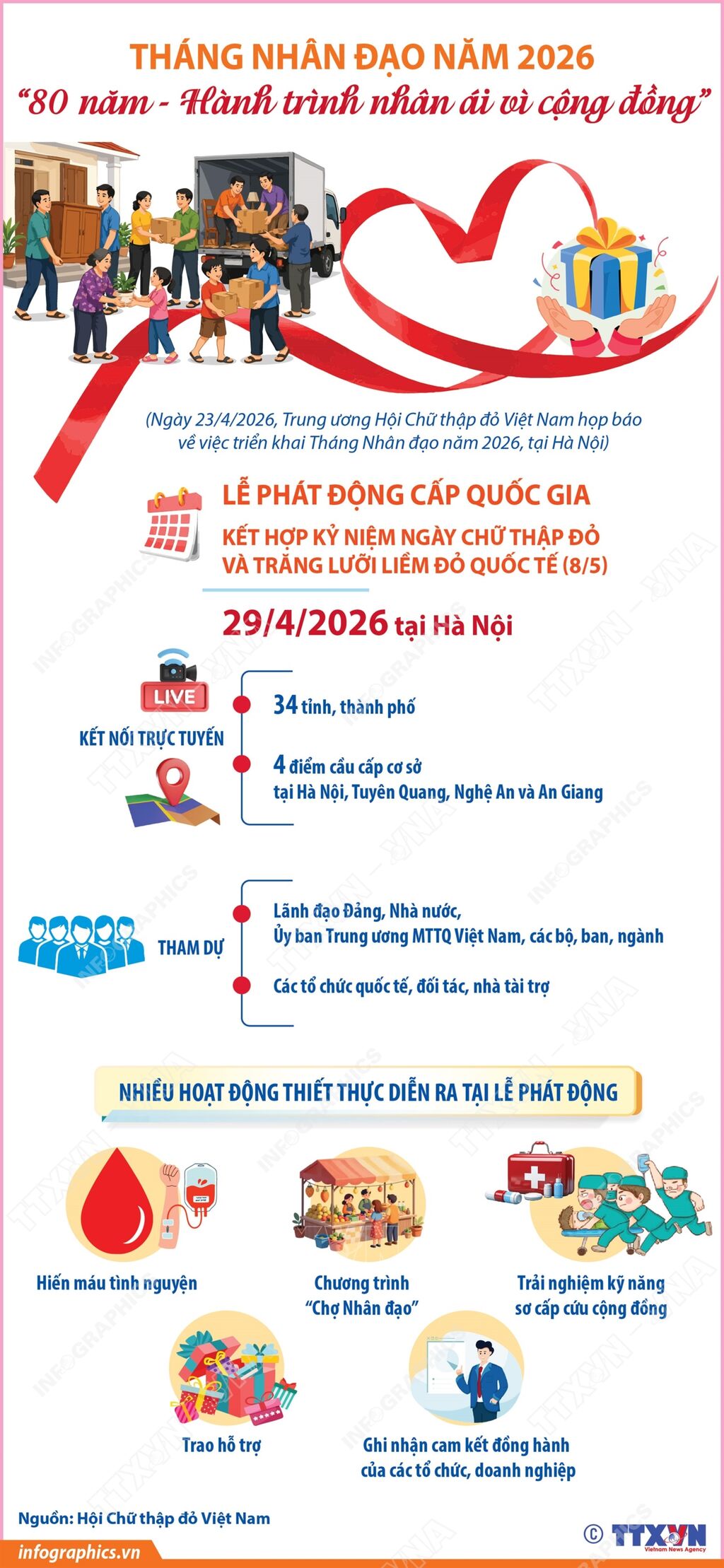 Theo thông tin từ Hội Chữ thập đỏ Việt Nam, Lễ phát động cấp quốc gia Tháng Nhân đạo năm 2026, kết hợp kỷ niệm Ngày Chữ thập đỏ và Trăng lưỡi liềm đỏ quốc tế (8/5) được tổ chức vào ngày 29/4/2026 tại Hà Nội, với sự tham dự của lãnh đạo Đảng, Nhà nước, Ủy ban Trung ương Mặt trận Tổ quốc Việt Nam, các bộ, ban, ngành, tổ chức quốc tế, đối tác và nhà tài trợ. Chương trình được kết nối trực tuyến tới 34 tỉnh, thành phố và 4 điểm cầu cấp cơ sở tại Hà Nội, Tuyên Quang, Nghệ An và An Giang.
