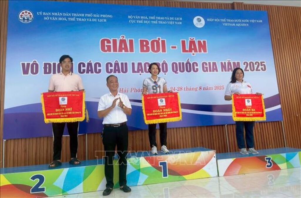 Ban tổ chức trao giải cho các đoàn tại Giải bơi lặn vô địch các câu lạc bộ quốc gia năm 2025. Ảnh: Hoàng Ngọc – TTXVN