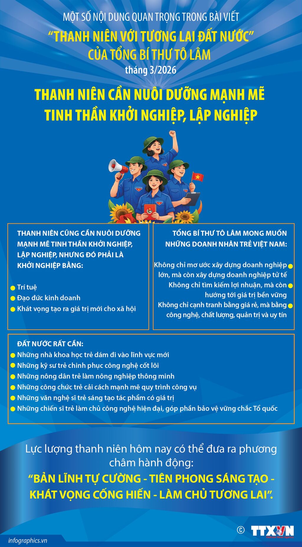 Trong bài viết “Thanh niên với tương lai đất nước”, Tổng Bí thư Tô Lâm khẳng định: Lực lượng thanh niên hôm nay có thể đưa ra phương châm hành động: “Bản lĩnh tự cường - Tiên phong sáng tạo - Khát vọng cống hiến - Làm chủ tương lai”.