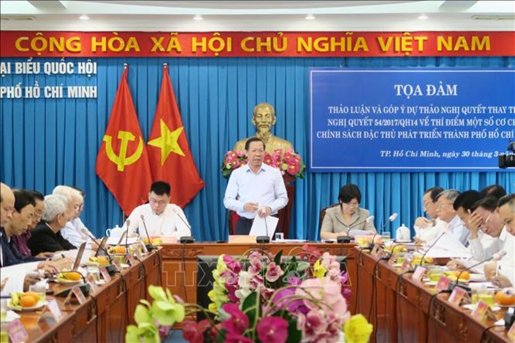 Tại toạ đàm, Chủ tịch UBND Thành phố Hồ Chí Minh Phan Văn Mãi cho biết, trong lần xây dựng Nghị quyết mới này, Thành phố không đặt trọng tâm vào việc khai thác nguồn thu như Nghị quyết 54 hiện hành mà đề nghị được thí điểm cơ chế vượt trội, đột phá để huy động nguồn lực, phát huy tiềm năng của Thành phố. Trong đó, có những vấn đề luật chưa quy định, có những vấn đề luật có quy định nhưng còn chồng chéo với nhau, không giải quyết được.