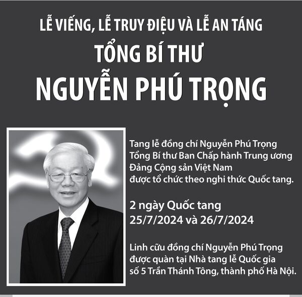 Trước đó, UBND Thành phố Hồ Chí Minh có thông cáo báo chí về Lễ viếng và Lễ truy điệu đồng chí Tổng Bí thư Nguyễn Phú Trọng tại Hội trường Thống Nhất (Thành phố Hồ Chí Minh). Cụ thể, Lễ viếng từ 7 giờ đến 22 giờ ngày 25/7/2024 (thứ Năm) và từ 7 giờ đến 12 giờ 30 ngày 26/7/2024 (thứ Sáu). Lễ truy điệu lúc 13 giờ ngày 26/7/2024 (thứ Sáu).