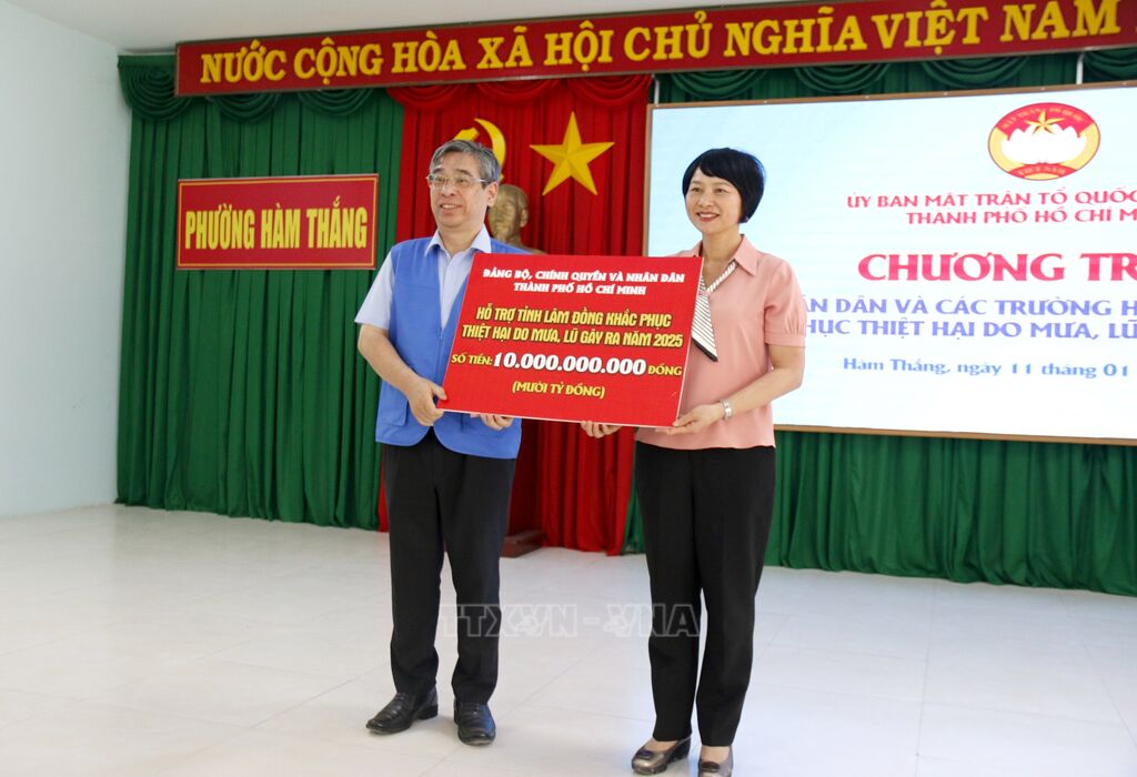Chiều 11/1, tại phường Hàm Thắng (Lâm Đồng) Ủy ban Mặt trận Tổ quốc Việt Nam Thành phố Hồ Chí Minh tổ chức chương trình hỗ trợ nhân dân và các trường học tại tỉnh Lâm Đồng khắc phục thiệt hại do mưa, lũ gây ra trong cuối năm 2025. Đây là hoạt động mang ý nghĩa nhân văn sâu sắc, thể hiện sự quan tâm, sẻ chia kịp thời của các cấp, các ngành và toàn xã hội, góp phần động viên bà con sớm vượt qua khó khăn, vươn lên ổn định cuộc sống.