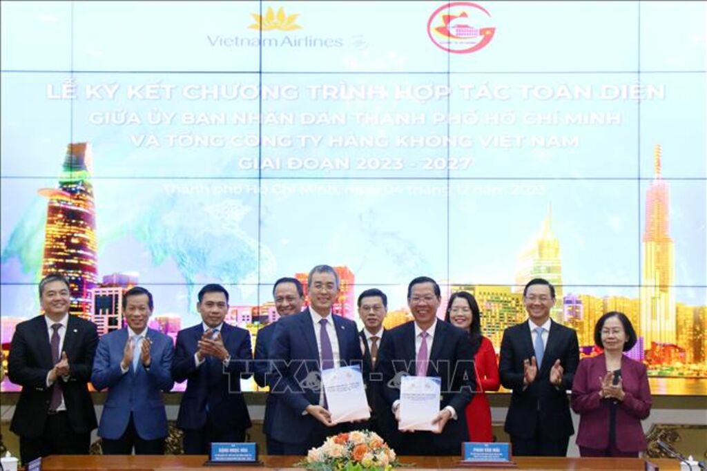 TTXVN - Chiều 4/12, UBND Thành phố Hồ Chí Minh và Tổng Công ty Hàng không Việt Nam - Vietnam Airlines tổ chức ký kết Chương trình hợp tác toàn diện giai đoạn 2023 - 2027, hướng đến với mục tiêu thúc đẩy phát triển kinh tế - xã hội, nhất là quảng bá điểm đến Thành phố Hồ Chí Minh trong thời gian tới.