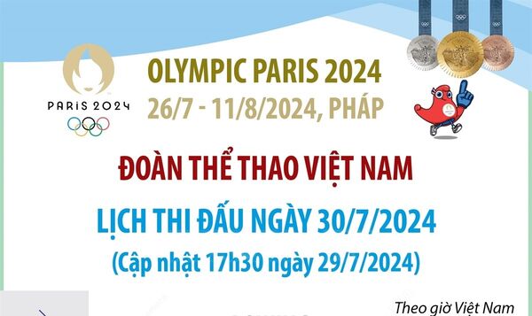Lịch thi đấu của Đoàn thể thao Việt Nam tại Olympic Paris 2024 ngày 30/7 và rạng sáng 31/7/2024 (cập nhật 17h30 ngày 29/7/2024)