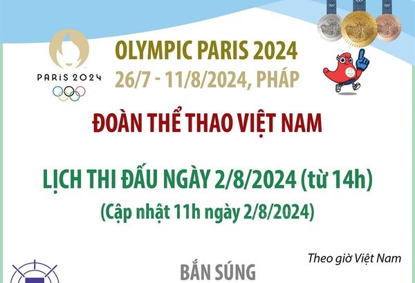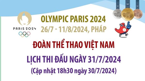 Ngày 31/7 và rạng sáng ngày 1/8/2024 tại Olympic Paris 2024, Đoàn Thể thao Việt Nam sẽ có các vận động viên tranh tài là Nguyễn Thùy Linh và Lê Đức Phát (cầu lông), Phạm Thị Huệ (Rowing); Đỗ Thị Ánh Nguyệt (bắn cung). -