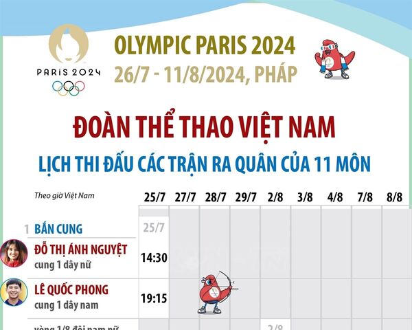 Lịch thi đấu của Đoàn thể thao Việt Nam tại Olympic Paris 2024 ngày 30/7 và rạng sáng 31/7/2024 (cập nhật 17h30 ngày 29/7/2024)