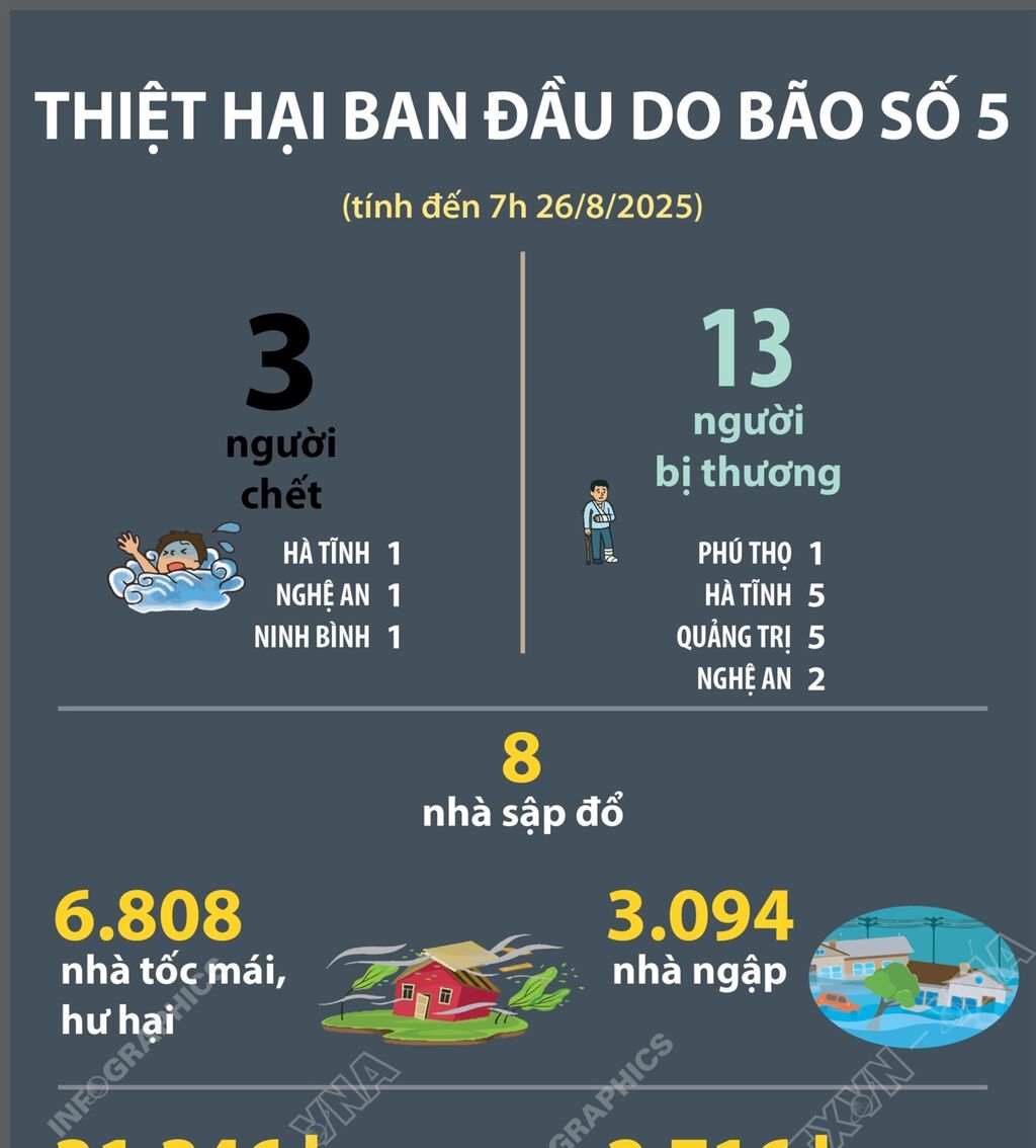 Tính đến 6 giờ ngày 26/8, bão số 5 làm 3 người chết, 3 người bị thương, 8 nhà sập đổ ; 6.808 nhà tốc mái, hư hại.