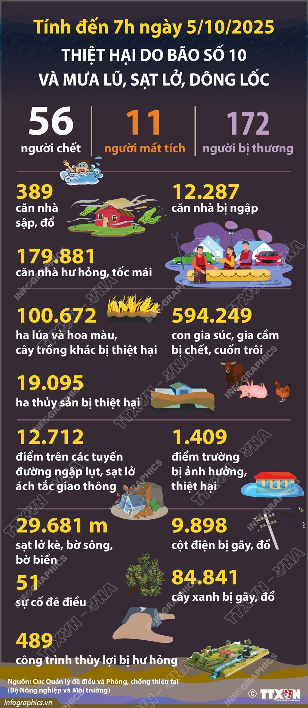 Theo báo cáo của các tỉnh, thành phố, tính đến 7h ngày 5/10/2025, bão số 10 và mưa lũ, sạt lở, giông lốc đã làm 67 người chết và mất tích, 172 người bị thương; 389 nhà sập, đổ; 179.881 nhà hư hỏng, tốc mái; 3.477 con gia súc, 590.772 con gia cầm bị chết, cuốn trôi…