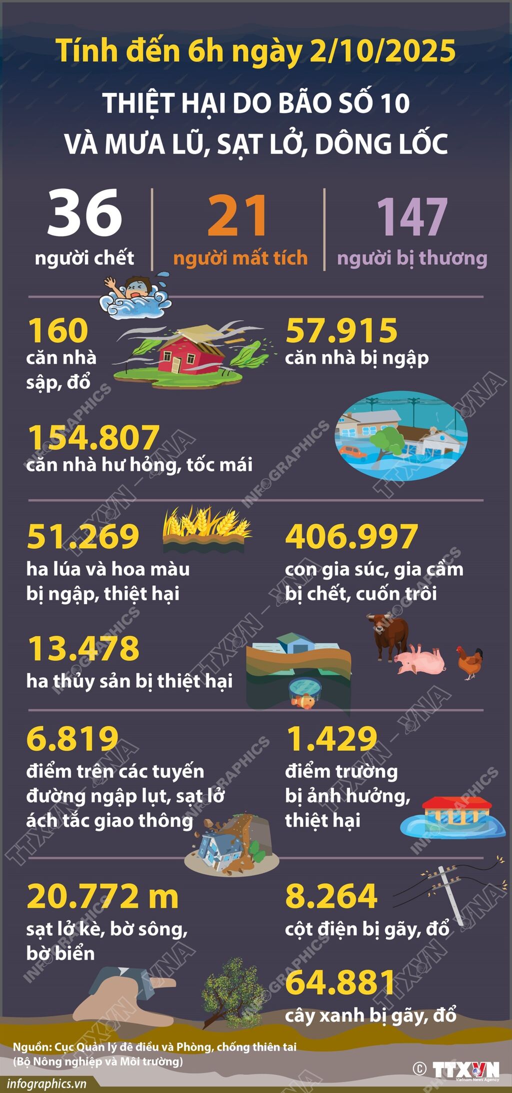 Theo báo cáo của các tỉnh, thành phố Lào Cai, Sơn La, Phú Thọ, Tuyên Quang, Lạng Sơn, Cao Bằng, Thái Nguyên, Bắc Ninh, Quảng Ninh, TP Hải Phòng, Hưng Yên, Ninh Bình, Thanh Hóa, Nghệ An, Hà Tĩnh, Quảng Trị, TP Huế, TP Đà Nẵng, tính đến 6h ngày 2/10/2025, bão số 10 và mưa lũ, sạt lở, dông lốc đã làm 36 người chết, 21 người mất tích, 147 người bị thương; 160 căn nhà bị sập, đổ; 154.807 căn nhà bị tốc mái, hư hỏng; 51.269 ha lúa và hoa màu, 13.478 ha thủy sản bị ngập, thiệt hại..