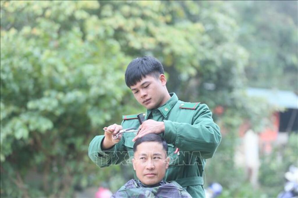 Các chiến sĩ của Đồn Biên phòng Chiềng Tương cắt tóc miễn phí cho người dân và các em học sinh ở xã Lóng Phiêng. Ban Tổ chức cũng trao 10 xe đạp cho các em học sinh có hoàn cảnh khó khăn vượt khó vươn lên trong học tập.