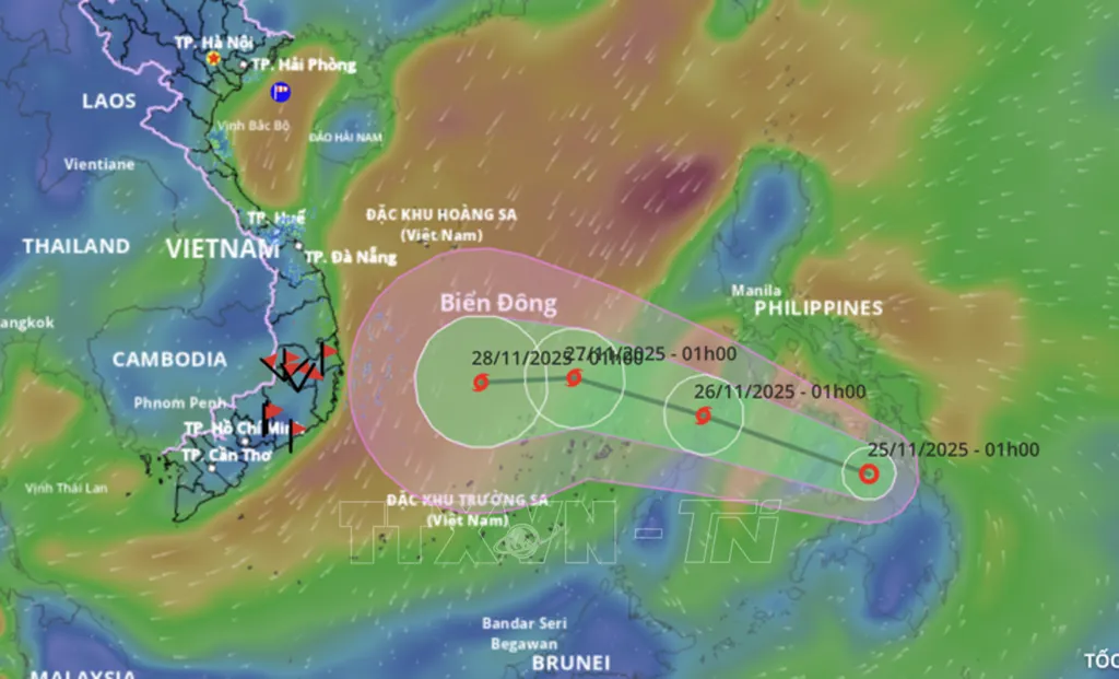 Dự báo đến 01 giờ ngày 26/11, áp thấp nhiệt đới di chuyển theo hướng Tây Tây Bắc, khoảng 20-25 km/h, có khả năng đi vào Biển Đông, vị trí ở trên vùng biển phía Đông Nam khu vực giữa Biển Đông, có khả năng mạnh lên thành bão. Cường độ gió cấp 8, giật cấp 10. Khu vực chịu ảnh hưởng là vùng biển phía Đông khu vực giữa Biển Đông và vùng biển phía Đông Bắc khu vực Nam Biển Đông, cấp độ rủi ro thiên tai cấp 3.