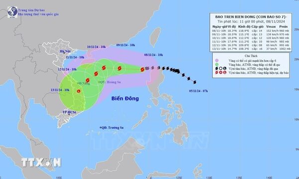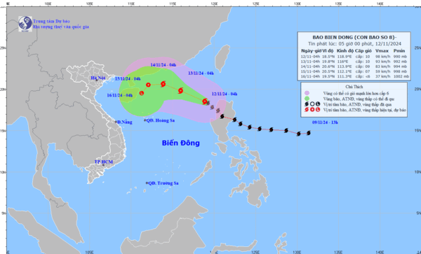 Lúc 4 giờ ngày 12/11, vị trí tâm bão số 8 ở vào khoảng 18,5 độ Vĩ Bắc; 118,9 độ Kinh Đông, trên vùng biển phía Đông của khu vực Bắc Biển Đông. Sức gió mạnh nhất vùng gần tâm bão mạnh cấp 10 (89-102 km/h), giật cấp 12. Bão số 8 di chuyển theo hướng Tây Bắc, tốc độ khoảng 10-15 km/h. -