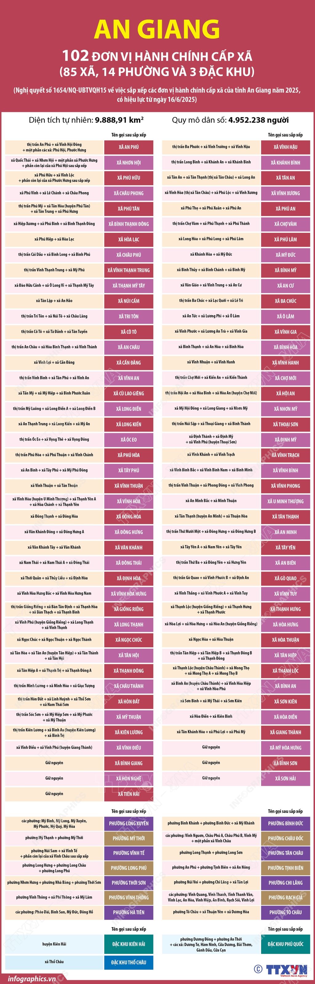 Theo Nghị quyết số 1654/NQ-UBTVQH15 ngày 16/6/2025 của Ủy ban Thường vụ Quốc hội, sau khi sắp xếp, tỉnh An Giang có 102 đơn vị hành chính cấp xã, gồm 85 xã, 14 phường và 03 đặc khu; trong đó có 79 xã, 14 phường, 03 đặc khu hình thành sau sắp xếp quy định tại Điều này và 06 xã không thực hiện sắp xếp là các xã Mỹ Hòa Hưng, Bình Giang, Bình Sơn, Hòn Nghệ, Sơn Hải, Tiên Hải.