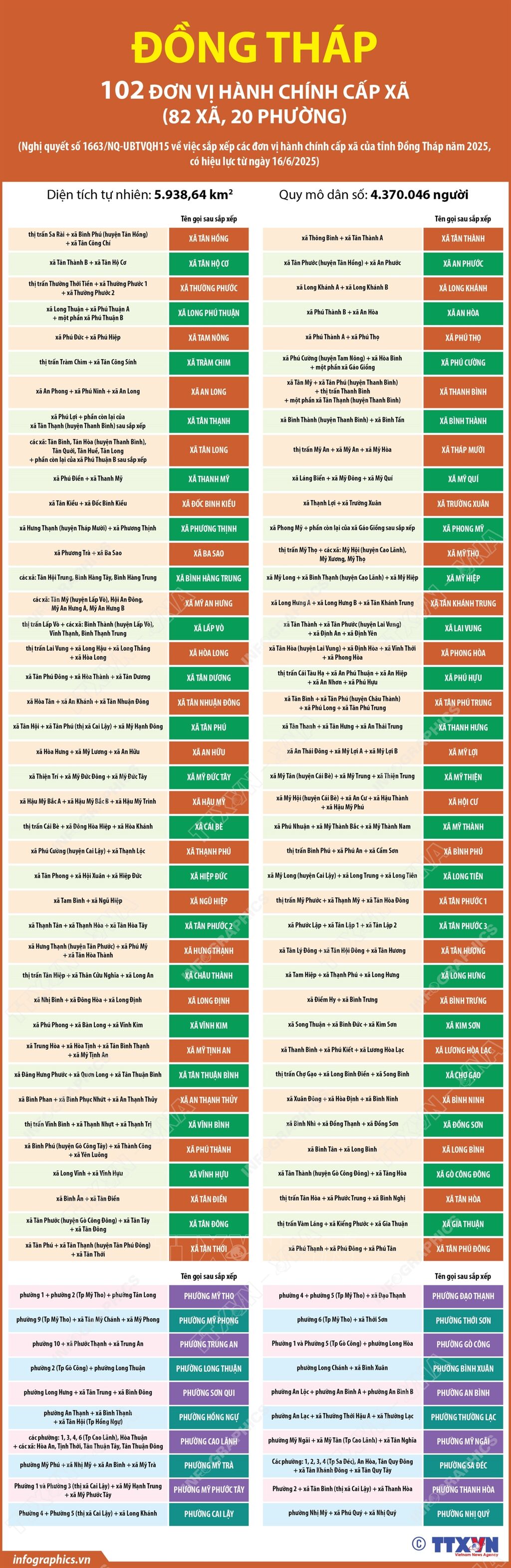 Hà Nội (TTXVN 2/7) Theo Nghị quyết số 1663/NQ-UBTVQH15 ngày 16/6/2025 của Ủy ban Thường vụ Quốc hội, sau khi sắp xếp, tỉnh Đồng Tháp có 102 đơn vị hành chính cấp xã, gồm 82 xã và 20 phường.