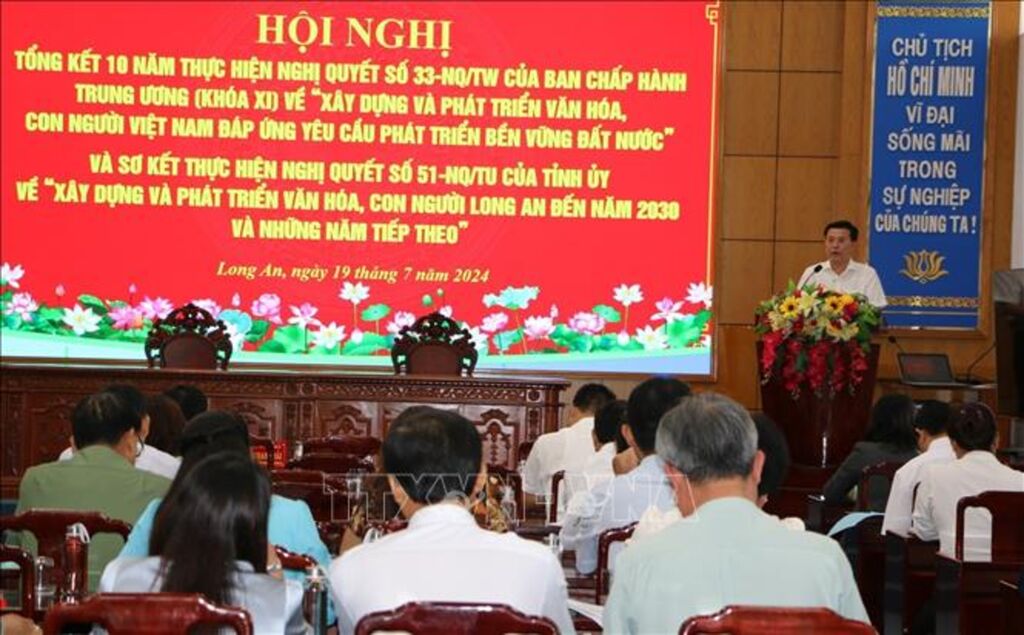 Ngày 19/7, Tỉnh ủy Long An tổ chức Tổng kết 10 năm thực hiện Nghị quyết số 33-NQ/TW, ngày 9/6/2014 của Ban Chấp hành Trung ương (khóa XI) về “Xây dựng và phát triển văn hóa, con người Việt Nam đáp ứng yêu cầu phát triển bền vững đất nước"; sơ kết thực hiện Nghị quyết số 51-NQ/TU, ngày 4/1/2023 của Tỉnh ủy về “Xây dựng và phát triển văn hóa, con người Long An đến năm 2030 và những năm tiếp theo” trên địa bàn.
