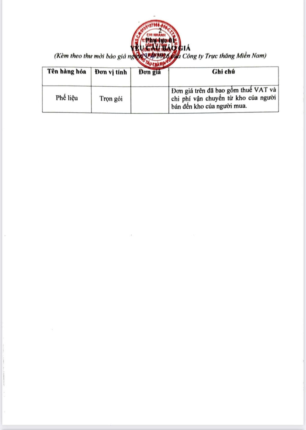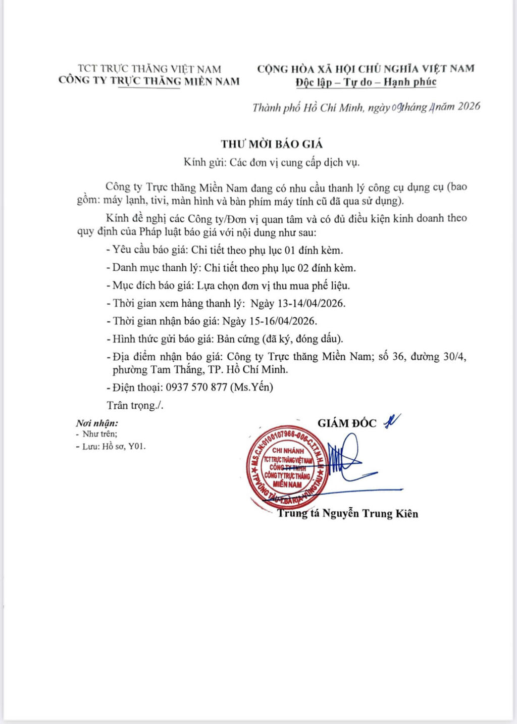 - Địa điểm nhận báo giá: Công ty Trực thăng Miền Nam; số 36, đường 30/4, phường Tam Thắng, TP. Hồ Chí Minh.