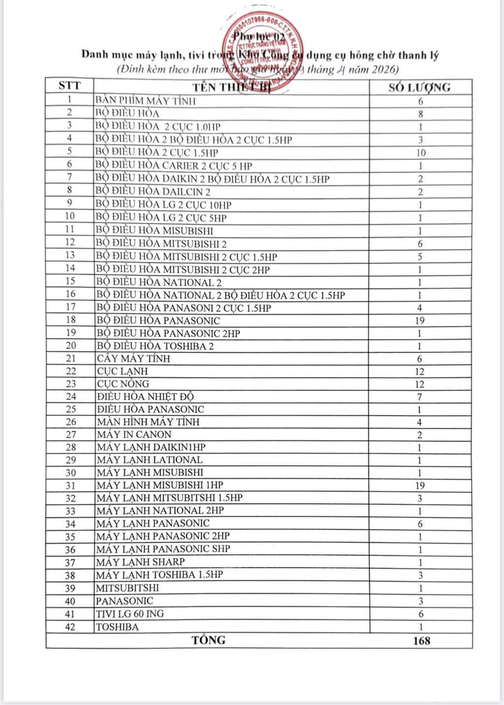 Công ty Trực thăng Miền Nam đang có nhu cầu thanh lý công cụ dụng cụ (bao gồm: máy lạnh, tivi, màn hình và bàn phím máy tính cũ đã qua sử dụng).