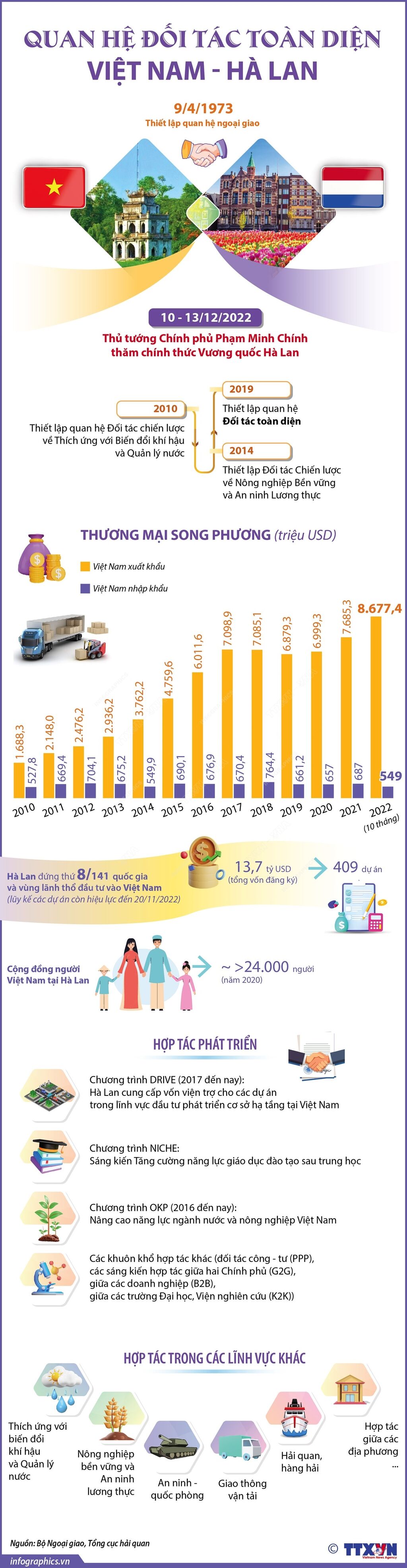 Trong những năm qua, quan hệ Việt Nam - Hà Lan phát triển mạnh mẽ trên nhiều lĩnh vực, nhất là về đầu tư, thương mại, nông nghiệp và ứng phó với biến đổi khí hậu. Hà Lan là đối tác thương mại lớn thứ hai của Việt Nam ở châu Âu và là nhà đầu tư lớn nhất của EU tại Việt Nam. Trao đổi thương mại song phương năm 2021 đạt 8,37 tỷ USD, tăng gần 10% so với năm 2020; 9 tháng của năm 2022 đạt 8,2 tỷ USD, tăng 36% so với cùng kỳ năm 2021.