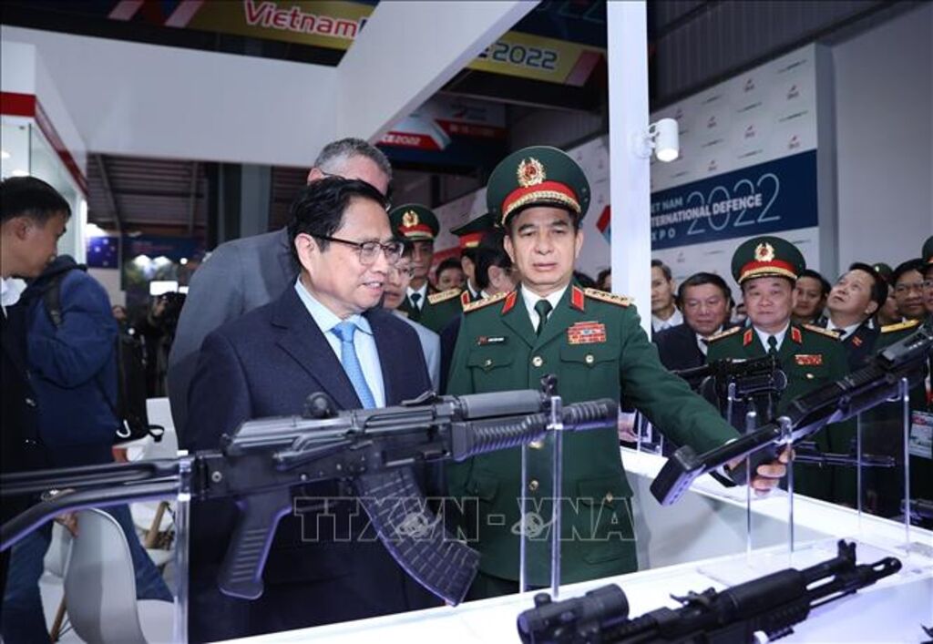 Thủ tướng Phạm Minh Chính tham quan trưng bày sản phẩm vũ khí, khí tài tại Triển lãm Quốc phòng quốc tế Việt Nam 2022. (Ảnh: Dương Giang /TTXVN)
