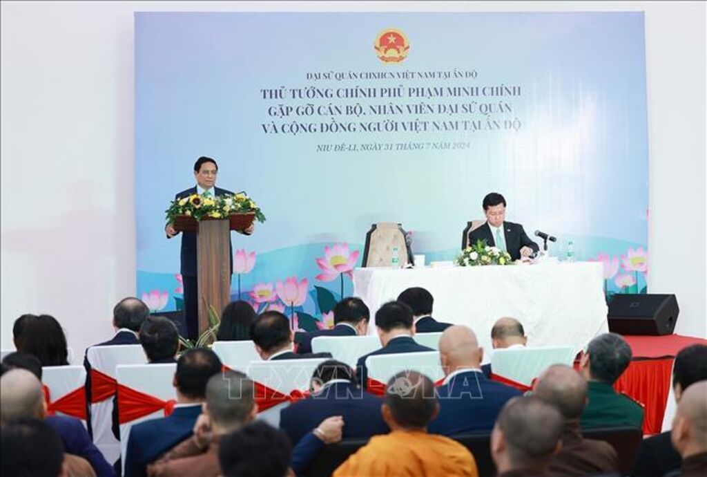 Chia sẻ với cán bộ, nhân viên Đại sứ quán và cộng đồng người Việt Nam tại Ấn Độ những nét lớn về tình hình đất nước, Thủ tướng Phạm Minh Chính nhấn mạnh Việt Nam là một trong những nước chịu nhiều đau khổ, mất mát nhất kể từ sau Chiến tranh Thế giới thứ hai. Song dưới sự lãnh đạo của Đảng, chúng ta đã kiên định con đường độc lập dân tộc và chủ nghĩa xã hội, phát huy sức mạnh đại đoàn kết toàn dân tộc, kết hợp sức mạnh dân tộc và sức mạnh thời đại. Nhờ đó, sau gần 40 năm đổi mới, Việt Nam đã đạt được những thành tựu to lớn, có ý nghĩa lịch sử, đất nước ta chưa bao giờ có được cơ đồ, tiềm lực, vị thế và uy tín quốc tế như ngày nay.