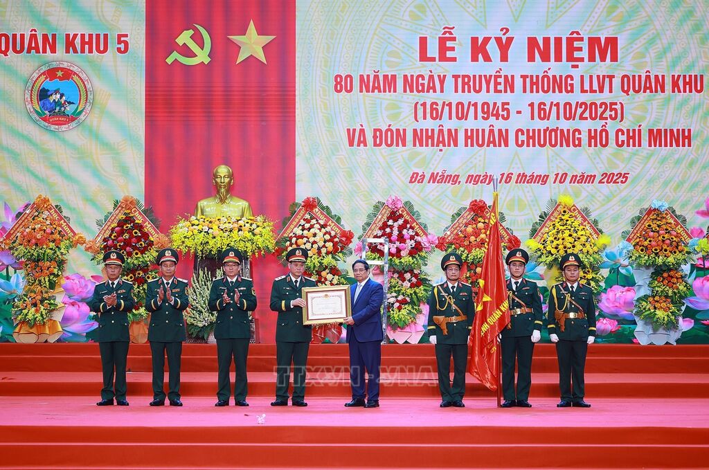 Chiều 16/10, tại thành phố Đà Nẵng, Ủy viên Bộ Chính trị, Thủ tướng Chính phủ Phạm Minh Chính dự Lễ kỷ niệm 80 năm Ngày truyền thống Lực lượng vũ trang Quân khu 5 (16/10/1945 - 16/10/2025) và đón nhận Huân chương Hồ Chí Minh lần thứ 3 - phần thưởng cao quý của Đảng, Nhà nước ghi nhận quá trình xây dựng, chiến đấu, chiến thắng và trưởng thành của Quân khu 5 trong suốt chặng đường 80 năm qua.