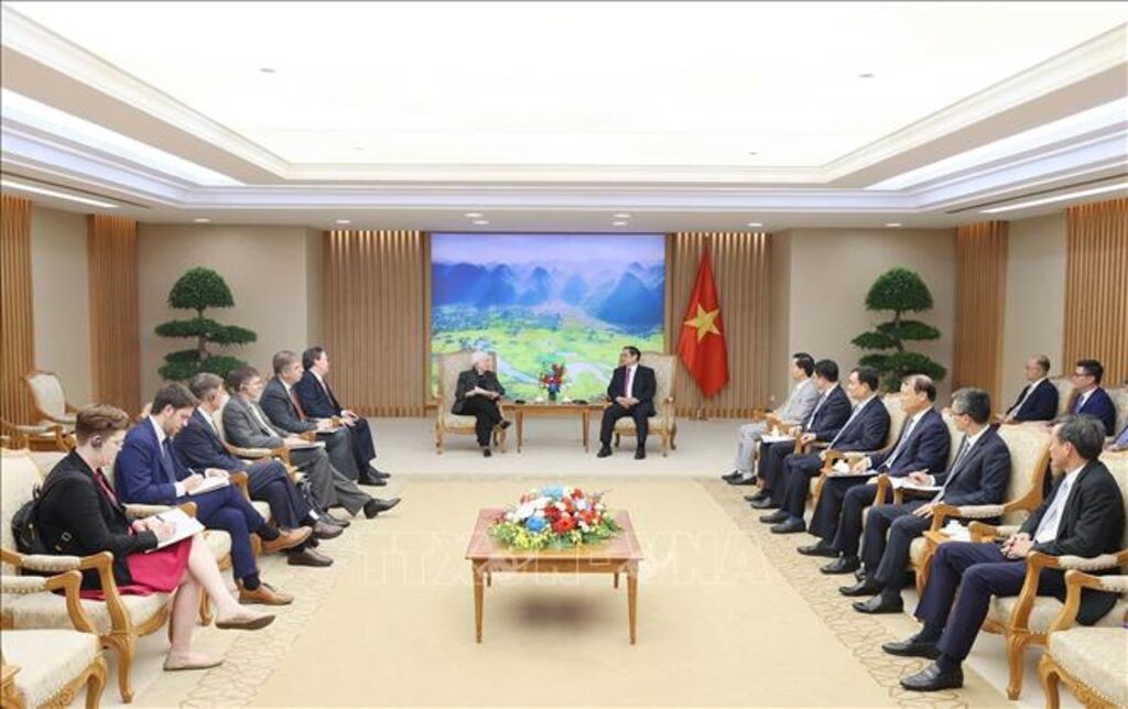 Thủ tướng đề nghị tăng cường phối hợp giữa hai bên trong tăng cường kết nối hai nền kinh tế, hợp tác thương mại, gia tăng khả năng phục hồi của chuỗi cung ứng, thúc đẩy doanh nghiệp Hoa Kỳ mở rộng và tiếp tục đầu tư tại Việt Nam, nhất là trong các lĩnh vực công nghệ cao, xây dựng quan hệ thương mại hài hòa, bền vững và cùng có lợi; thúc đẩy hợp tác giữa Việt Nam và Hoa Kỳ trong ứng phó với biến đổi khí hậu, thực hiện Tuyên bố Đối tác chuyển dịch năng lượng công bằng (JETP), hỗ trợ Việt Nam phát triển ngành công nghiệp năng lượng tái tạo, thành lập thị trường carbon trong nước kết nối với thị trường quốc tế.