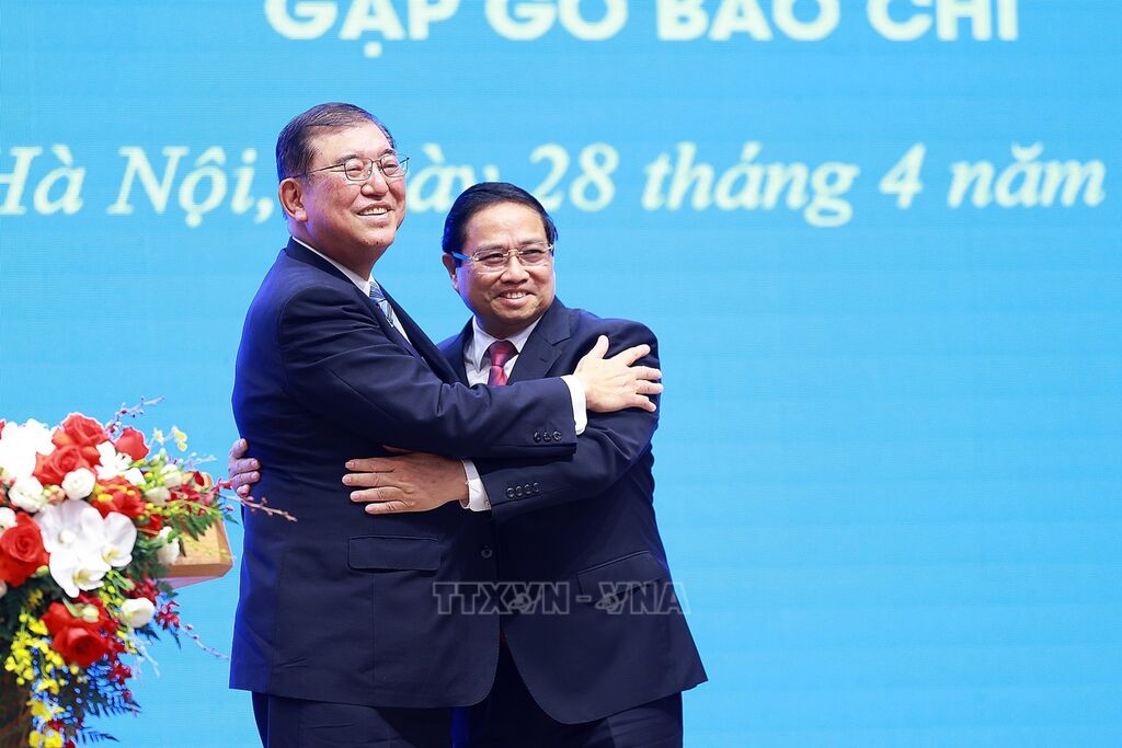 Sáng 28/4, tại Trụ sở Chính phủ, ngay sau hội đàm với kết quả tốt đẹp, Thủ tướng Chính phủ Phạm Minh Chính và Thủ tướng Nhật Bản Ishiba Shigeru đã có cuộc gặp gỡ báo chí chung thông báo kết quả hội đàm.