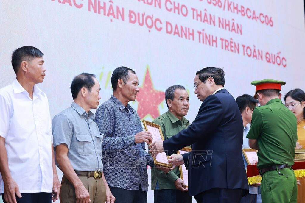 Thủ tướng Chính phủ Phạm Minh Chính và lãnh đạo Bộ Công an, Bộ Nội vụ trao Quyết định về việc xác định hài cốt liệt sĩ còn thiếu thông tin cho đại diện 15 gia đình liệt sĩ.