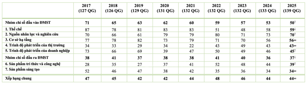 Ông Phạm Đình Nguyên, Giám đốc Học viện Chiến lược Khoa học và công nghệ (Bộ Khoa học và Công nghệ) cho biết: Có thể nói, việc Bộ Chính trị ban hành các Nghị quyết quan trọng như Nghị quyết số 57-NQ/TW về đột phá phát triển khoa học, công nghệ, đổi mới sáng tạo và chuyển đổi số quốc gia, Nghị quyết 59-NQ/TW về hội nhập quốc tế trong tình hình mới, Nghị quyết số 68-NQ/TW về phát triển kinh tế tư nhân... cùng với Luật Khoa học Công nghệ và Đổi mới sáng tạo năm 2025, Nghị quyết số 193/2025/QH15 của Quốc hội về thí điểm một số cơ chế, chính sách đặc biệt tạo đột phá phát triển khoa học, công nghệ, đổi mới sáng tạo và chuyển đổi số quốc gia, được kỳ vọng sẽ tạo động lực cho những phát triển đột phá về về khoa học và công nghệ. Qua đó có thể giúp Việt Nam tiếp tục giữ được thứ hạng trong các năm tiếp theo và nếu làm tốt, đồng bộ Việt Nam sẽ có bước tiến cao hơn thứ hạng hiện nay để hướng đến mục tiêu vào năm 2030, chỉ số GII của Việt Nam thuộc nhóm 40 quốc gia hàng đầu thế giới đúng như mục tiêu của Chiến lược Phát triển khoa học công nghệ và đổi mới sáng tạo đã đặt ra đến năm 2030.