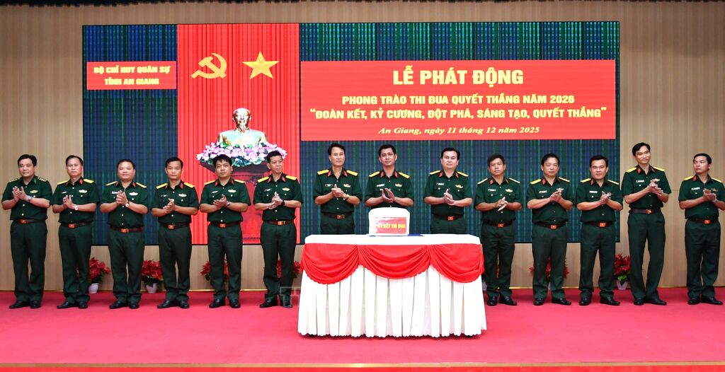 Nhằm đẩy mạnh các hoạt động thi đua khối cơ quan và các đơn vị trực thuộc, sáng 11/12, Bộ Chỉ huy Quân sự tỉnh An Giang tổ chức phát động Phong trào Thi đua Quyết thắng năm 2026. Phong trào năm nay với chủ đề “Đoàn kết, kỷ cương, đột phá, sáng tạo, Quyết thắng”, tư tưởng chỉ đạo xuyên suốt là: Tăng cường đoàn kết, giữ vững kỷ cương, quyết tâm đột phá, đổi mới sáng tạo, thực hiện tốt nội dung “2 kiên định, 2 đẩy mạnh và 2 ngăn ngừa” hoàn thành xuất sắc nhiệm vụ.